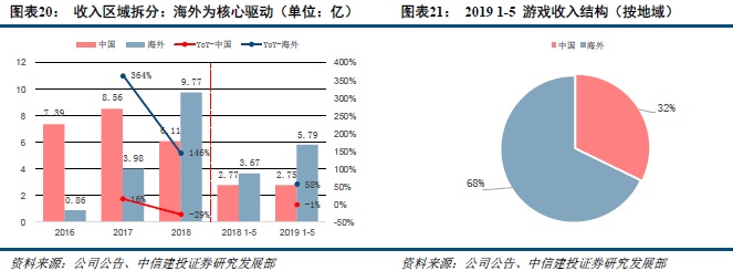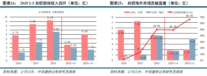 公司19H1自研游戏收入占比回升,海外市场贡献显著。根据公司招股说明书,2016年至2019年1月-5月期间,自研游戏收入分别对应为5.76亿元、8.35亿元、9.26亿元和6.06亿元,同比增速分别为45.1%、10.8%和-62.5%;授权游戏收入分别对应为1.79亿元、4.18亿元、6.62亿元和2.48亿元,同比增速分别为134%、58.3%和-34.6%。自研游戏收入在2019年1月-5月期间上升到70.9%,并且自研游戏海外市场收入的占比逐步增加,由2016年的1.4%增长至2019年1月-5月期间的70.9%。