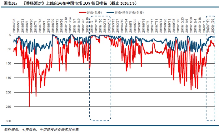 《香肠派对》自上线以来,在游戏榜单中的排名相对稳定,绝大多数时间在动作类游戏榜中排行靠前,在春节/寒假期间表现更佳。