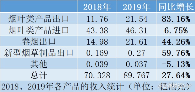 而在烟叶类产品进口业务方面,由于受到贸易摩擦的影响,该业务2019年的收入仅增长6.75%。这是因为2019年上半年中烟香港无法从美国购买产品,导致期内收入同比大跌37.64%。但在下半年,公司积极调整策略,从其他优质烟叶出口国进口产品,使得期内收入同比大增188.38%。
