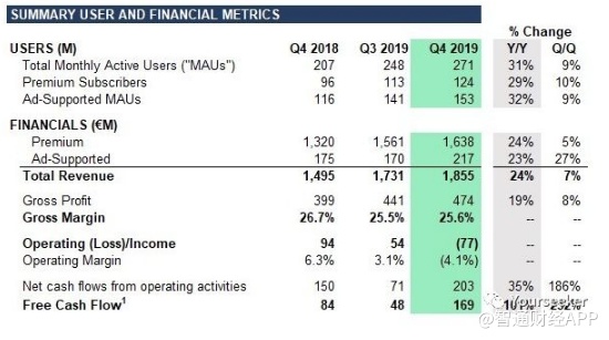 单纯谈论收入意义不大,我们加个角度。截至 2019 年底,YouTube 全球月活超过 20 亿,而 Spotify 财报里说,自己截至 2019Q4 的月活是 2.71 亿。