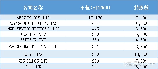 新增了12个标的,其中9个为持股,分别为美国电子商务企业亚马逊(AMZN.US)、网络基础设施整体解决方案提供商CommScope Holding Co(COMM.US)、IT企业Elastic NV(ESTC.US)、高性能数据中心开发商万国数据(GDS.US)、网络视频播放平台爱奇艺(IQ.US)、打车应用来福车(LYFT .US)、半导体企业恩智浦(NXPI.US)、移动支付企业PagSeguro(PAGA.US)和SaaS客户服务/支持管理软件提供商Zendesk(ZEN.US);另外3个标的为看涨期权,分别为摩根大通(JPM.US)、美国银行(BAC.US)和脸书(FB.US)。