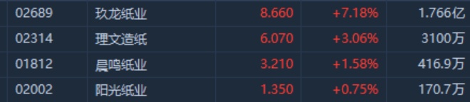 智通财经APP获悉,纸业股延续升势,玖龙纸业(02689)暂领涨板块,截至10时56分,玖龙纸业涨7.18%,报价8.66港元,理文造纸(02314)涨3.06%,报6.07港元。