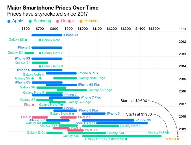 在苹果发布冬季季度业绩破坏了这些媒体报道之后,媒体从根本上扭转了其在下个月的手机定价报道,异常地为引进非常昂贵的安卓欢呼,并标出了Google,三星,华为不断上涨的要价(下图),而没有任何数据表明这些昂贵的新机型实际上没有以与iPhone相当的方式大量销售。