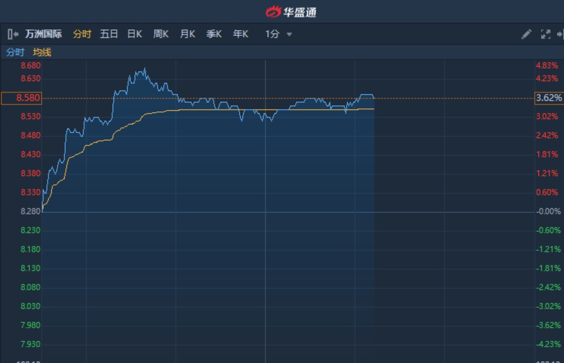 智通财经APP获悉,万洲国际(00288)盘中一度涨超4%,暂领涨蓝筹。截至14时15分,涨3.62%,报价8.58港元,成交额1.931亿。