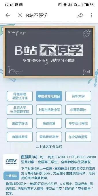 近日,B站联合清华大学、北京大学光华管理学院、学而思网校、上海格致中学等十余家机构,发起“B站不停学”计划,涵盖通识教育、时事热点、K12教学,为学生提供丰富、专业的学习类内容。