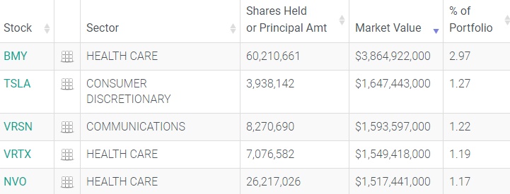 前五大重仓股中:施贵宝(BMY.US)位列第一,占比2.97%,市值约38.64亿美元。特斯拉(TSLA.US)位列第二,占比1.27%,市值约16.47亿美元。威瑞信(VRSN.US)位列第三,占比1.22%,市值约15.93亿美元。福泰制药(VRTX.US)和诺和诺德(NVO.US)分列第四第五,占比分别为1.17%和1.17%。