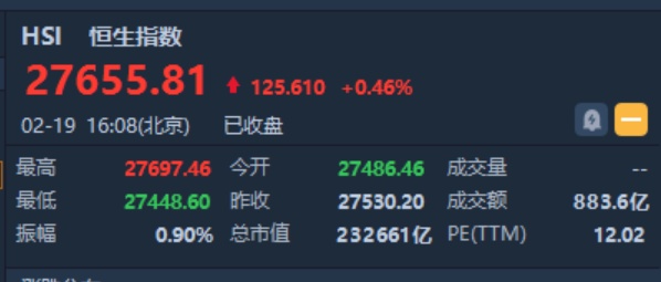 智通财经APP获悉,恒指早盘低开0.16%,报27486.46点。截至收盘,恒生指数涨125.61点或0.46%,报27655.81点,全日成交额达883.61亿。国企指数涨0.96%,报10908.57点,红筹指数涨1.13%,报4343.92点。