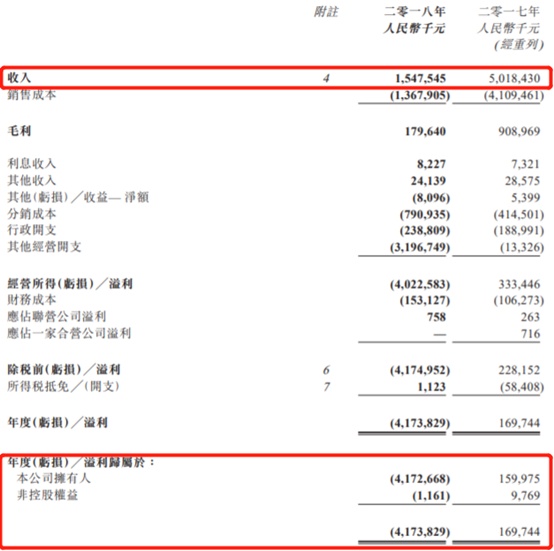 赴港上市之后,天喔还是有过一段风光日子,其2015年的销售额高达50亿元,然而,到2018年,这个数字锐减至15.72亿,同时归母净利润倒亏41.74亿。