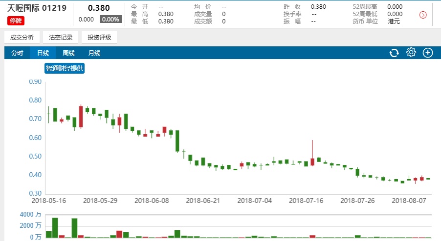 消息一出,复牌后天喔股价一日大跌24%,随即一路走低,停牌前公司股价已经沦为“仙股”,每股仅0.38港元。