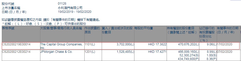 智通财经APP获悉,联交所最新资料显示,2月17日,美国资本集团增持永利澳门(01128)370.2万股,每股作价17.3822港元,总金额约为6434.89万港元。增持后最新持股数目约为4.7亿股,最新持股比例为9.06%。