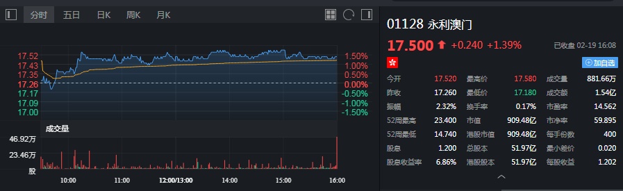 截至今日收盘,永利澳门涨1.39%,报17.5港元。