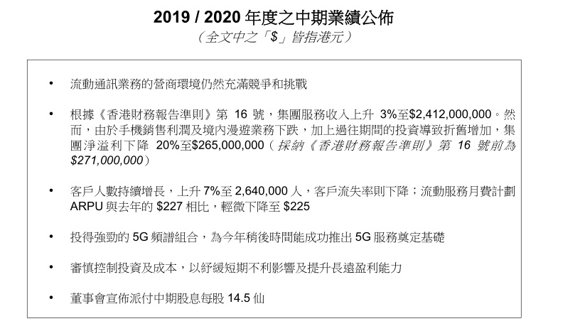 不过,就目前而言,数码通电讯的成本压力不容小觑。2019 / 2020年度中期,数码通电讯的频谱使用费摊销为1.43亿港元。