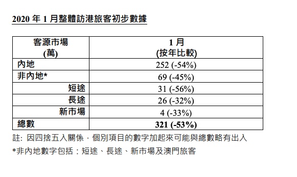据智通财经APP了解,香港旅游发展局2月14日公布最新访港旅客数字显示,2020年1月访港旅客同比大跌53%,当中内地访客下跌幅度达54%。香港旅发局也指出,据目前2月份最新数字显示,访港旅客人数持续下跌,单日访港旅客人次跌至低于3000人次,当中75%为非内地旅客,即单日入境内地游客不足千人。去年,内地旅客占到香港整体旅客人次的78%。