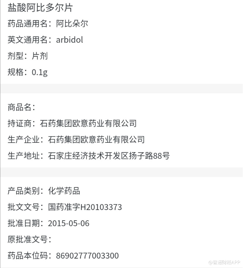 此后括武汉、上海、重庆等在内,很多省、市卫健委更是已石药生产的盐酸阿比多尔片列为“新型冠状病毒感染的肺炎防控首批药品储备清单”,在临床上大量使用。