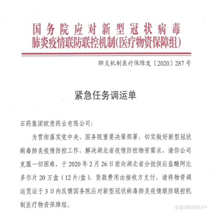 据统计,目前为止,重庆、上海、山西、河南、贵州、湖南、湖北、广东、四川、山东等多地已将盐酸阿比多尔片列入抗新型冠状病毒性肺炎保障用药清单。这意味着为了应对相应突发疾病,各地都会保持定量的采购。与此同时,智通财经APP还观察到,阿比多尔的入选的前一天,国务院医疗物质保障组又一次向石药提出了20万盒阿比多尔片的供货请求以支持湖北省。
