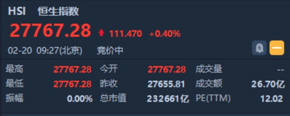 智通财经APP获悉,恒生指数开盘涨111.47点或0.4%,报27767.28点。国企指数涨0.39%,报10951.32点。红筹指数涨0.87%,报4381.86点。大市盘前成交26.71亿港元。