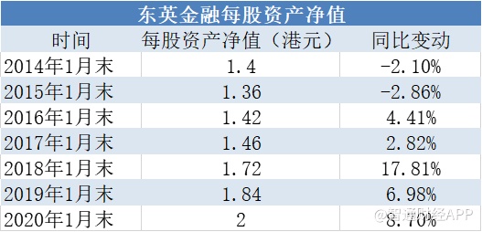 东英金融是一家投资公司,最直接的指标看每股资产净值。从2015年以来,该公司每股资产净值稳步上升,最新数据显示,2020年1月31日,东英金融每股股份的未经审核资产净值约为2港元,较2015年增长约47.06%,大幅跑赢期内恒生指数涨幅。