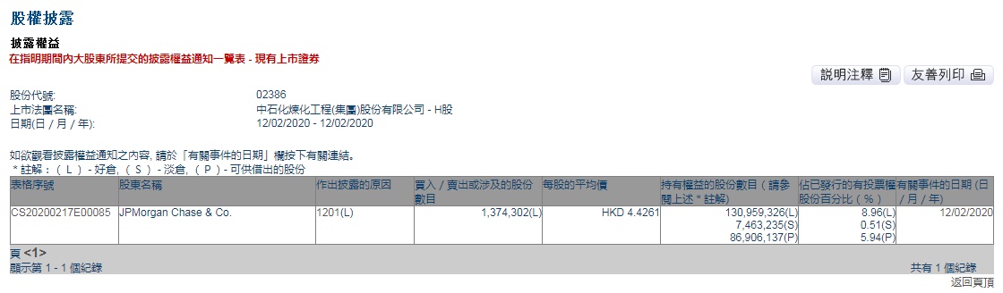智通财经APP获悉,联交所最新资料显示,2月12日,摩根大通减持中石化炼化工程(02386)137万股,每股作价4.4261港港元,总金额约为606.38万港元。减持后最新持股数目约为1.31亿股,最新持股比例为8.96%。