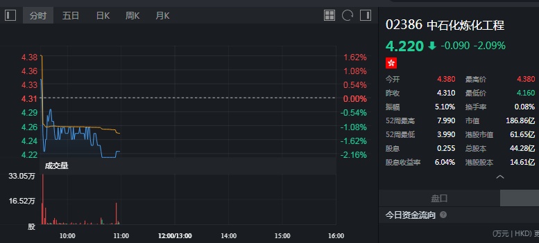 截至发稿,中石化炼化工程跌2.09%,报4.22港元。
