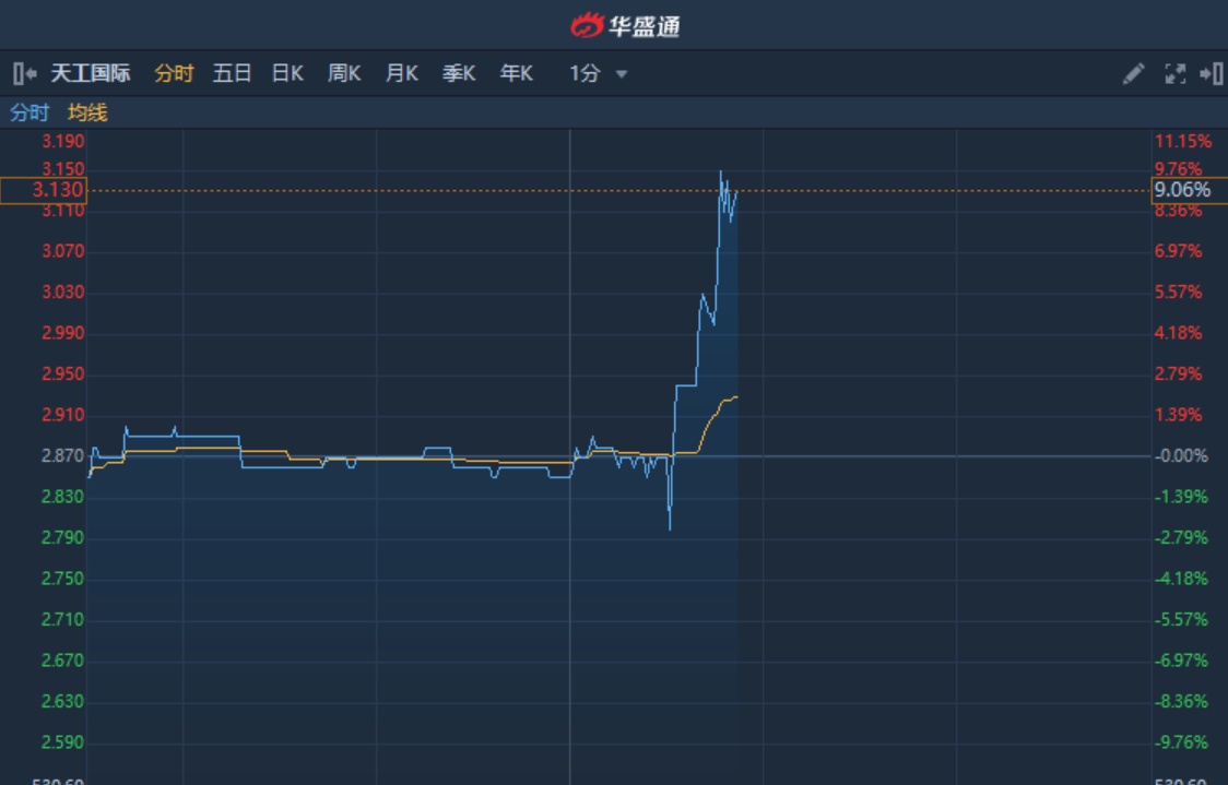 智通财经APP获悉,天工国际(00826)午后突获资金追捧,放量急升逾9%,突破多条均线。截至13时51分,涨9.06%,报价3.13港元,成交额1.78亿。