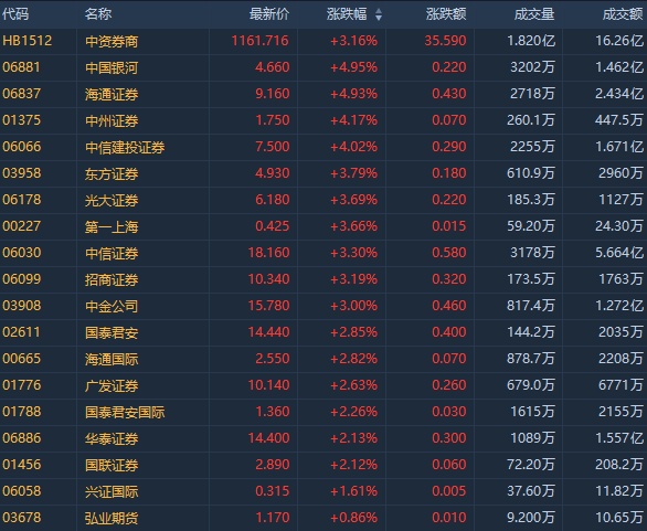 截至发稿,海通证券(06837)涨4.81%,报9.15港元;中国银河(06881)涨4.73%,报4.65港元;中信建投证券(06066)涨3.88%,报7.49港元;光大证券(03958)涨3.69%,报6.18港元;中信证券(06030)涨3.3%,报18.16港元。