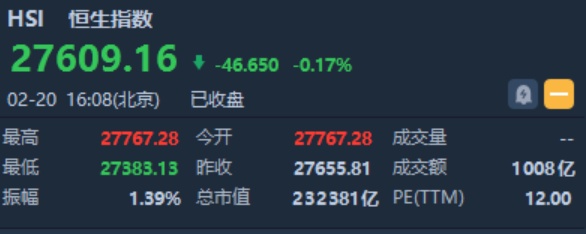 智通财经APP获悉,恒指早盘高开111.47点或0.4%,报27767.28点。截至收盘,恒生指数跌46.65点或0.17%,报27609.16点,全日成交额达1008.79亿。国企指数涨0.05%,报10913.97点,红筹指数跌0.35%,报4328.5点。