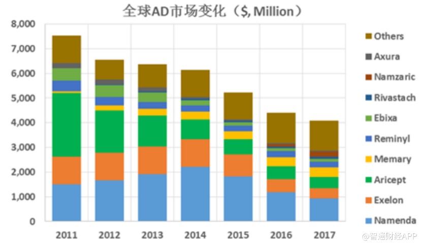 目前距离美金刚获批已有17年,因为没有新分子实体获批上市,导致AD治疗市场逐年萎缩。2017年全球AD治疗市场规模为40.8亿美元,相较2010年下降了5成。