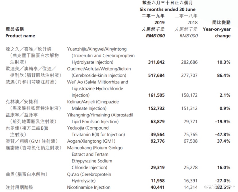 四环医药产品管线中的脑苷肌肽、曲克芦丁脑蛋白水解物 、丹参川芎嗪 、马来酸桂哌齐特 、前列地尔 、单唾液酸四己糖神经节苷脂、脑蛋白水解物全等7种药物均被点名,这7个品种合计占2019年上半年总营收的79%。