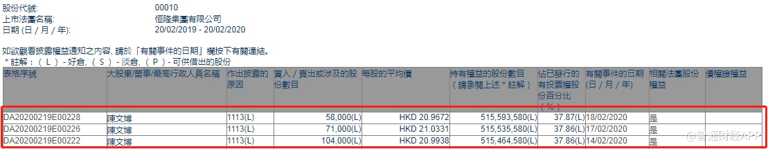 智通财经APP获悉,联交所最新资料显示,2月14日、17日及18日,陈文博三日增持恒隆集团(00010)共23万股,每股作价分别为20.9938港元、21.0331港元及20.9672港元,总金额约为489.28万港元。增持后最新持股数目约为5.16亿股,最新持股比例为37.87%。