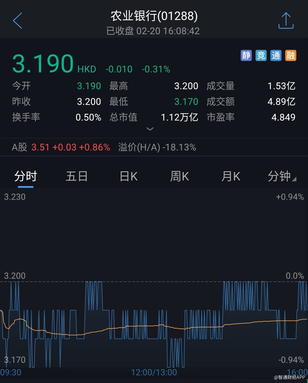 截至发稿,农业银行跌0.31%,报3.19港元。