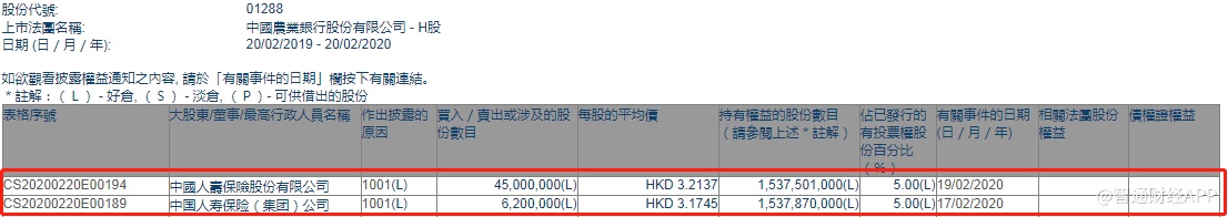 2月19日,中国人寿保险股份有限公司增持农业银行(01288)4500万股,每股作价3.2137港元,总金额约1.45亿港元。增持后最新持股数目约为15.38亿股,最新持股比例为5%。