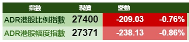智通财经APP获悉,周四美股高位回落,港股ADR指数全日受压,按比例计算,收报27400点,跌209.03点。