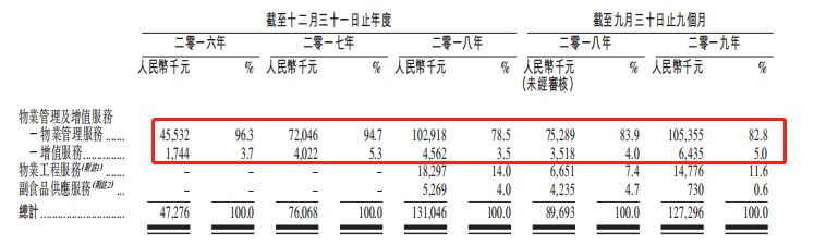 公司两个业务分部为:物业管理及增值服务 ,物业工程服务。于往绩记录期,大部分收益来自于在河南省郑州市提供物业管理及增值服务,分别占收益总额100.0%、100.0%、约82.0%及87.8%。整体增长趋势乃由于在管物业组合持续扩张所致。