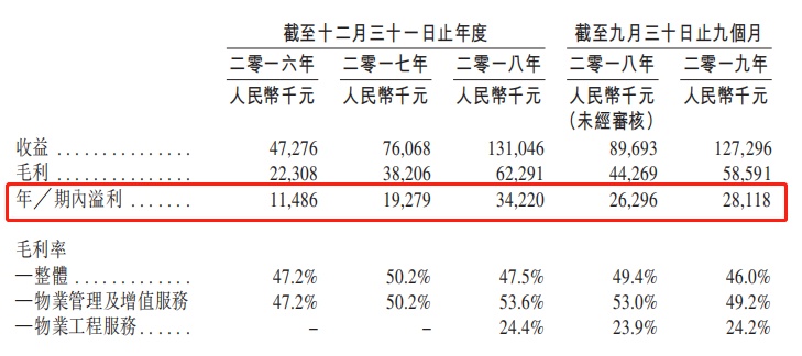 整体毛利一直呈上升趋势,与业务扩张令收益总额增加的整体趋势一致。整体毛利率由截至2018年12月31日止年度的约47.5%稍为降至截至2019年九月三十日止九个月的约46.0%,主要由于物业管理及增值服务毛利率下降所致。