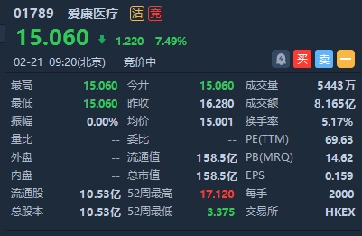智通财经APP获悉,爱康医疗(01789)公告,拟先旧后新配售5350万股认购股份,认购事项所得款项净额估计约为7.84亿港元。该股市前现一宗大手成交,涉及5350万股,涉资8.03亿港元,料为此项交易上板。截至发稿,跌7.49%,报15.06港元,成交额8.17亿港元。