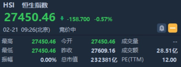 智通财经APP获悉,恒生指数开盘跌158.7点或0.57%,报27450.45点。国企指数跌0.64%,报10843.96点。红筹指数跌0.43%,报4309.77点。大市盘前成交28.51亿港元。