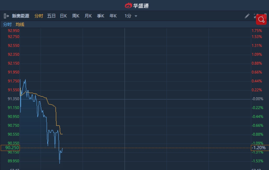 智通财经APP获悉,新奥能源(02688)盘中现两宗大手成交,每股作价90.15元及90.525元,共涉及103.69万股,共涉资9371.02万元。截至10时30分,跌1.2%,报价90.25港元,成交额1.203亿。