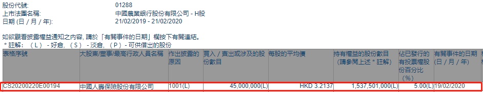 智通财经APP获悉,联交所最新资料显示,2月19日,中国人寿(02628)增持农业银行(01288)4500万股,每股作价3.2137港元,总金额约为1.45亿港元。增持后最新持股数目约为15.38亿股,最新持股比例为5%。