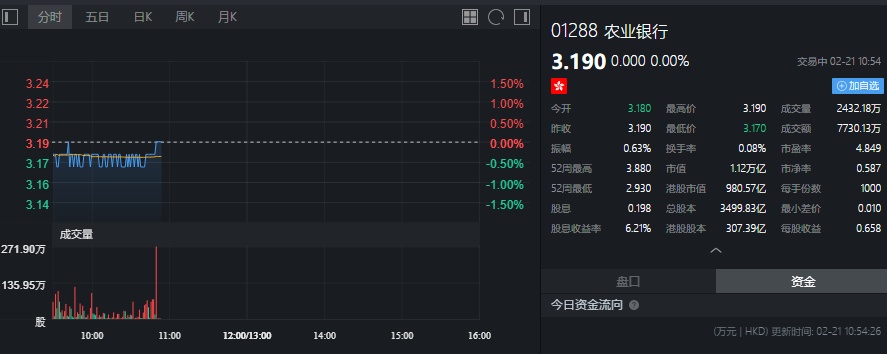 截至发稿,农业银行无涨跌,报3.19港元。