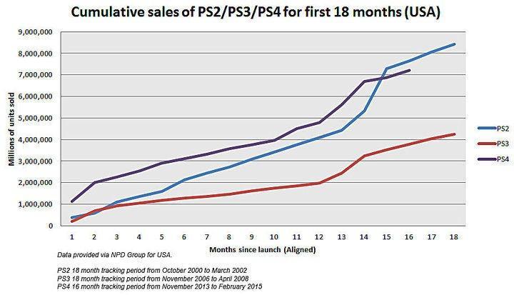 PS2、PS3、PS4发布18个月内的销量增速对比