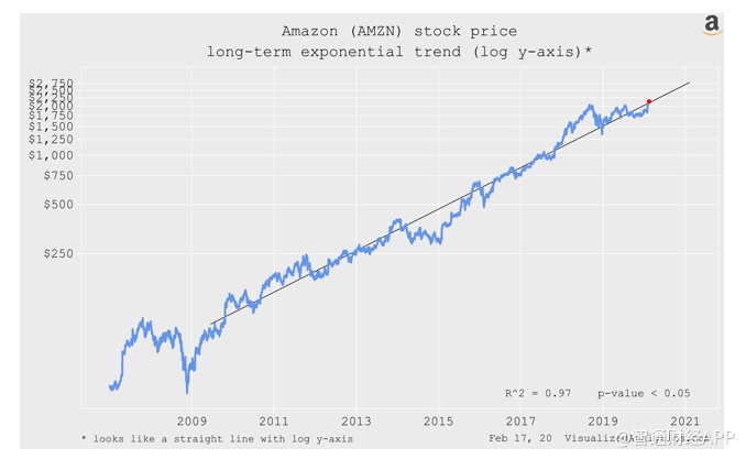 从2010年开始,亚马逊的股价就符合其长期的指数趋势,这对于一个成长中的上市公司来说是很典型的:
