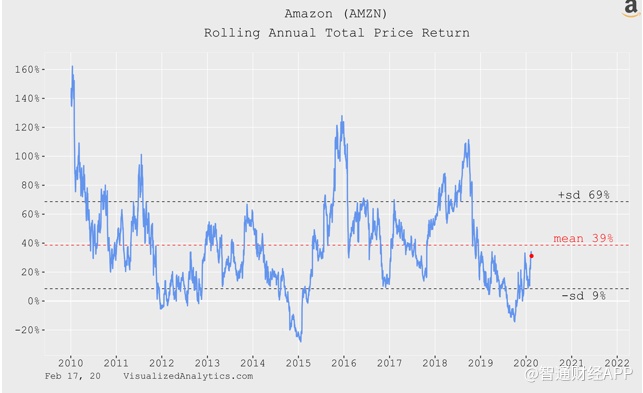 亚马逊的滚动年度总价格回报率回到了平均水平。这也是一个稳定的迹象。