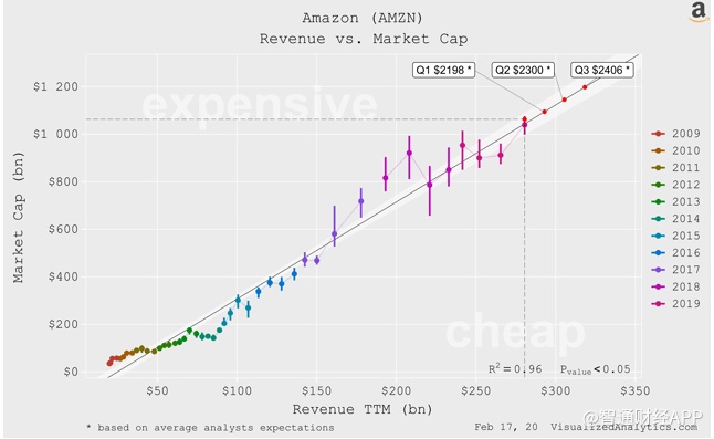 第一个是亚马逊的收入TTM绝对规模和公司资本之间的高度相关性:
