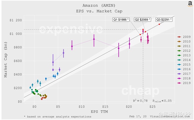 考虑到EPS TTM绝对规模与公司资本化之间的长期关系,我们也可以得出结论,亚马逊依然具有资本化的增长潜力: