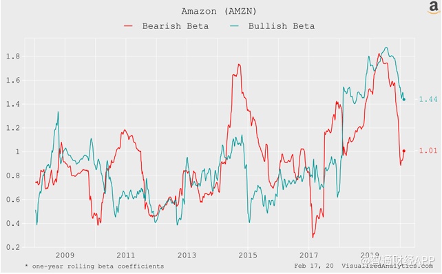 与此同时,亚马逊的熊市贝塔(股市下跌时股价如何下跌的衡量标准)远低于牛市贝塔(股市上涨时股价如何上涨的衡量标准):