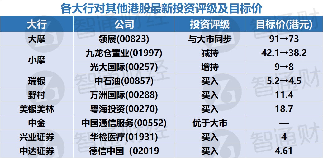 九、各大行对其他港股最新投资评级及目标价
