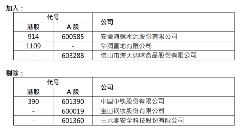 恒生神州50指数成分股数目固定为50只,但有以下变动:加入安徽海螺水泥股份有限公司(00914)、华润置地有限公司(01109)等,剔除中国中铁股份有限公司(00390)等。