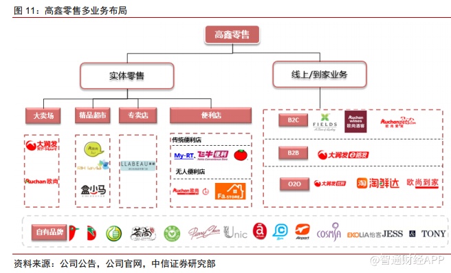 其中,高鑫零售先后推出“大润发优鲜”、“欧尚到家”app,与并淘鲜达、饿了么及天猫超市等平台入口进行合作,实现生鲜一小时到家服务,覆盖门店周边5 公里内客户范围。在供应链上,高鑫零售则于2019年9月于所有高鑫门店上线“猫超共享库存”一小时配送到家服务。