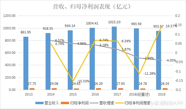 2019年,高鑫零售实现总销售收入1018.68亿元人民币,同比增长0.5%;实现收入953.57亿元,同比下降4.0%;实现归母净利润28.34亿元,同比增长14.4%。从历史数据表现来看,公司收入呈逐年下降趋势,但利润水平却在多数期间内维持增长。尤其是2019年,公司归母净利润实现6年来最高增速,营收表现仅次于2014年。