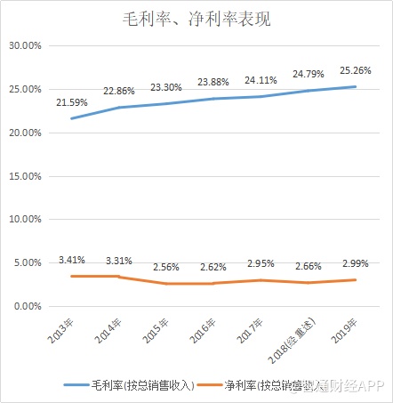 得益于高鑫零售对产品组合优化、以及对双品牌供应链的整合等措施奏效,在盈利表现方面,公司盈利能力有所增强。具体表现为毛利率连续7年保持逐年提升,净利率也有所改善,较去年同期提升0.33个百分点,接近3%水平。